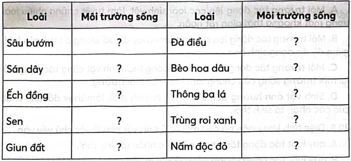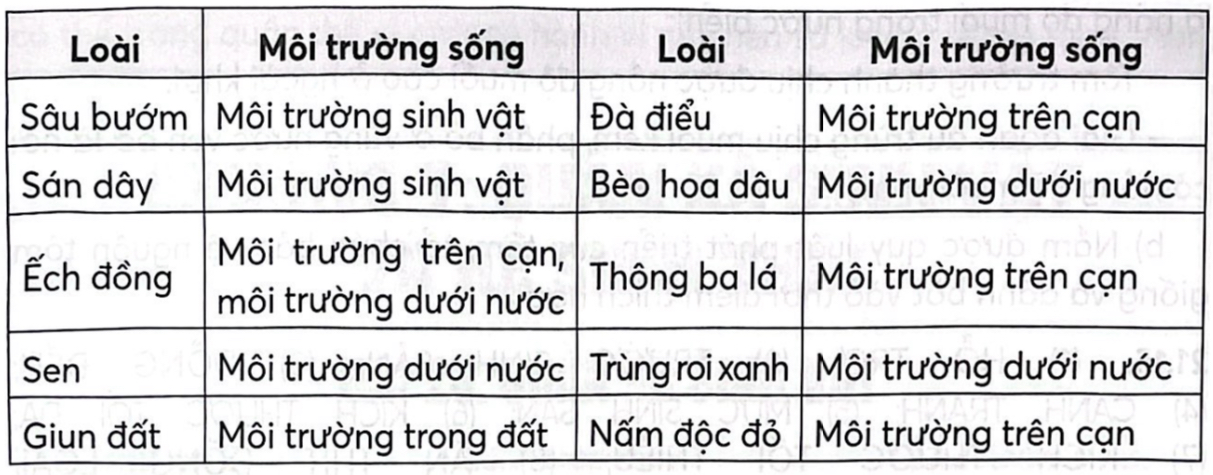Xác định môi trường sống của một số loài sinh vật trong bảng sau.