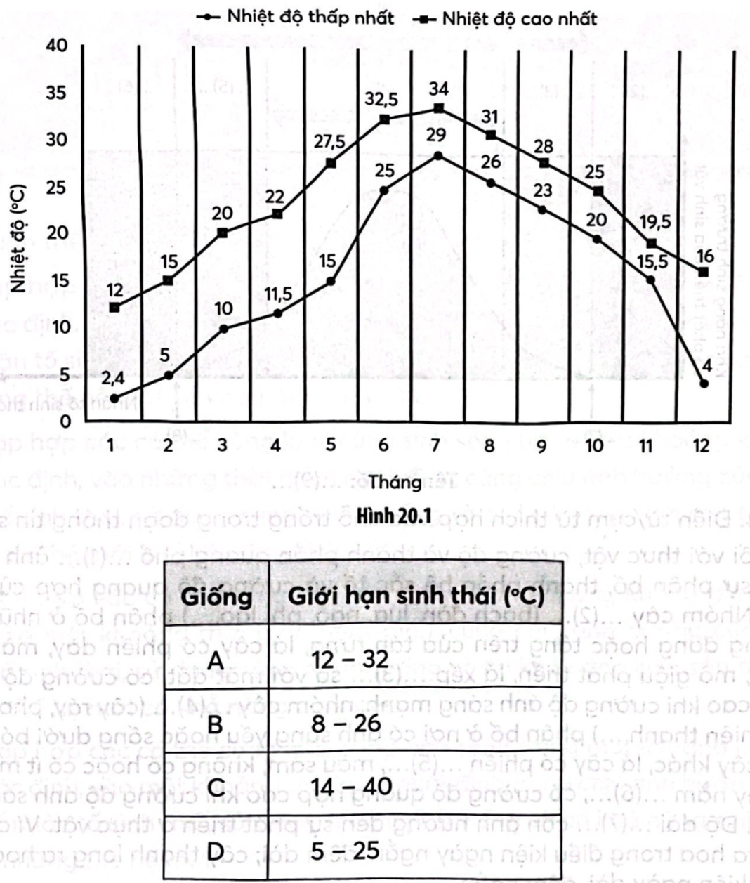 Một người nông dân muốn xây dựng trang trại chăn nuôi tại vùng đồng bằng, ông đã tiến hành khảo sát và thu thập số liệu về nhiệt độ cao nhất và thấp nhất theo tháng ở vùng này cũng như giới hạn sinh thái về nhiệt độ của một số giống vật nuôi. Kết quả khảo sát về nhiệt độ của vùng được minh họa trong biếu đồ Hình 20.1, còn số liệu trong bảng là giới hạn sinh thái về nhiệt độ của bốn giống vật nuôi. Thi gian sinh trưởng từ khi bắt đầu nuôi trong môi trường tự nhiên đến khi xuất chuồng của các giống vật nuôi A, B, C và D tối thiểu là 160 ngày. Giả sử các điều kiện sinh thái khác của môi trường không ảnh hưởng đến sức sống của các giống vật nuôi đang nghiên cứu.