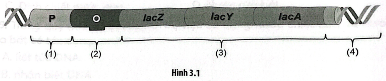 Hình 3.1 mô tả cấu trúc của operon Lac ở vi khuẩn E. coli. Cấu trúc số mấy có chức năng mã hóa cho các enzyme giúp vi khuẩn chuyển hóá và sử dụng đường lactose?