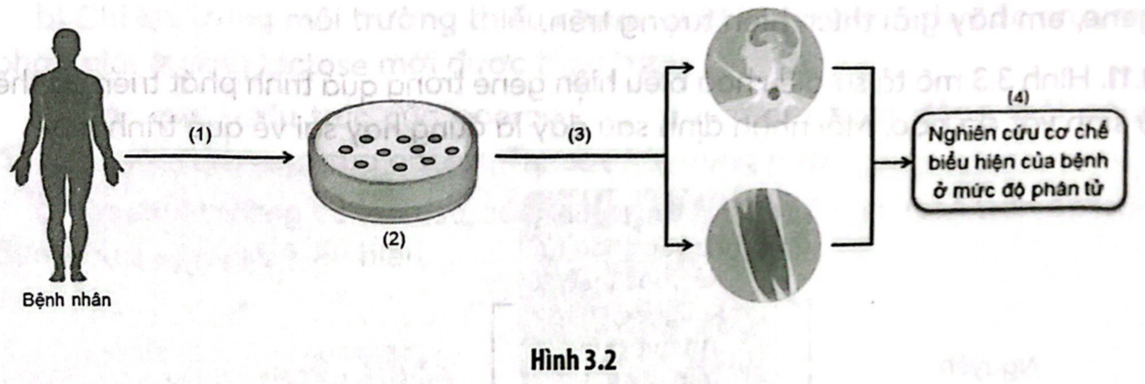 Hình 3.2 mô tả sơ đồ mô hình hóa bệnh di truyền dựa vào biệt hóá tế bào gốc đa năng cảm ứng ở người (Human induced pluripotent stem cell - hiPSC) phục vụ nghiên cứu cơ chế gây bệnh ở mức độ phân tử. Hãy cho biết quá trình điều hòà biểu hiện gene diễn ra ở giai đoạn nào.