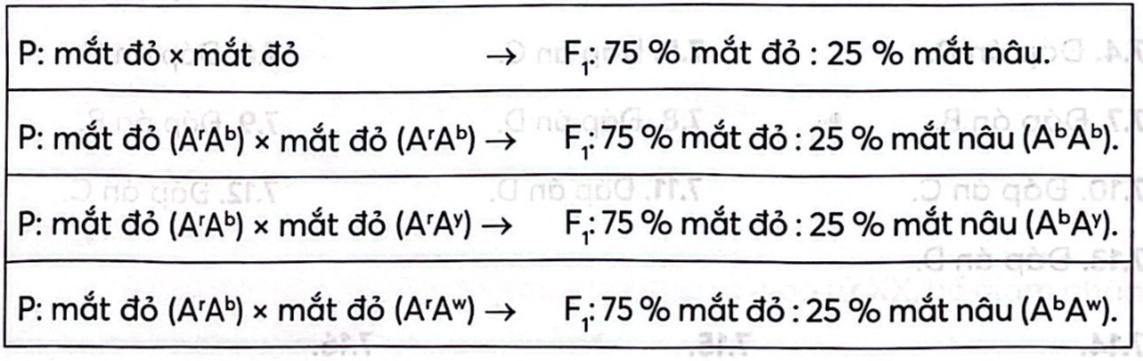 - Phép lai 1: mắt đỏ x mắt đỏ → F1: 75% mắt đỏ: 25% mắt nâu.