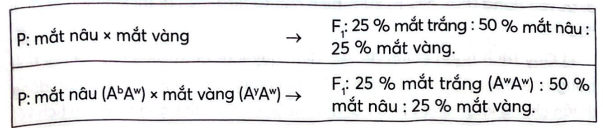 - Phép lai 3: mắt nâu x mắt vàng →F1: 25% mắt trắng : 50% mắt nâu : 25% mắt vàng.