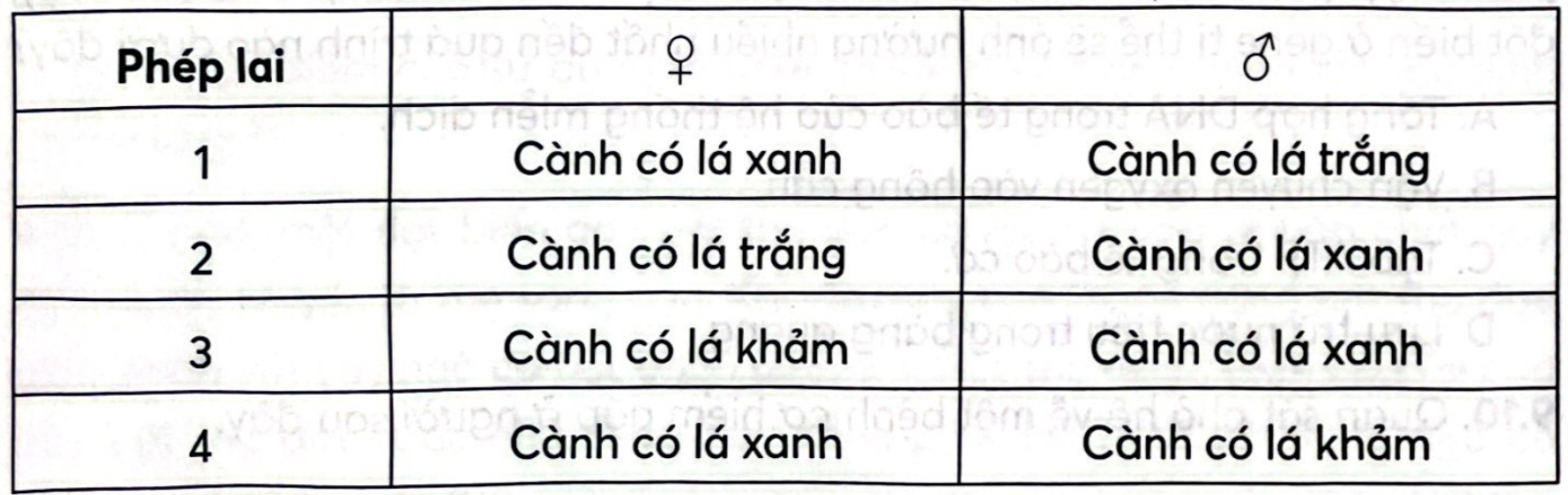 Do đột biến trong lục lạp khiến màu sắc lá không thể phát triển nên cây có thể có lá màu xanh lục, trắng hoặc khảm. Khi cho hoa của các cây giao phấn với nhau như trong bảng dưới đây, kết quả của phép lai nào không đúng?