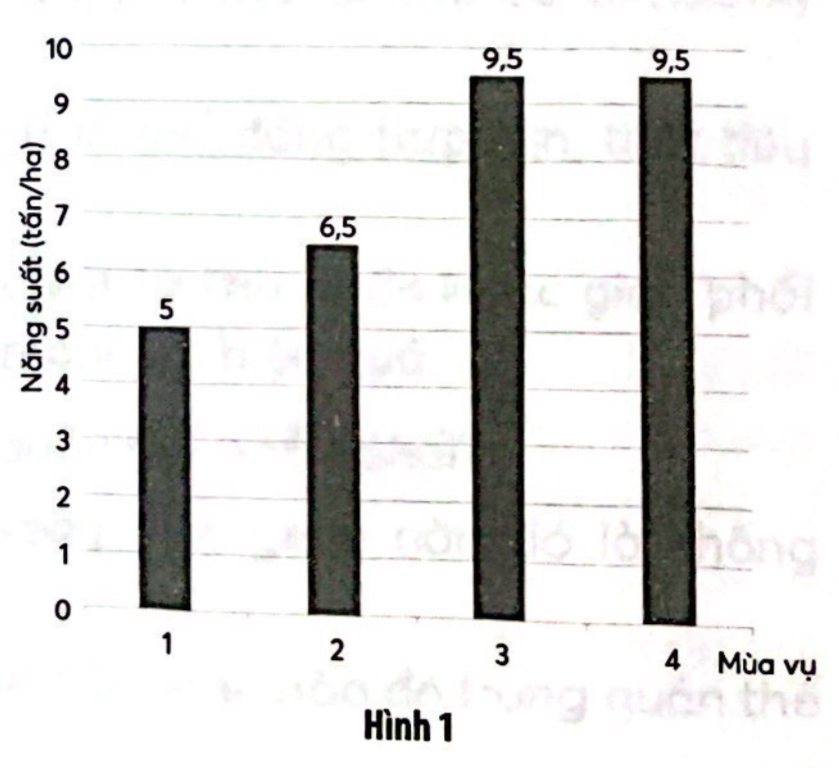 Một người nông dân chọn giống lúa A để gieo trồng. Trong mùa vụ đầu, do chưa có kinh nghiệm canh tác nên chỉ thu hoạch được 5 tấn/ha. Ở các mùa vụ sau, ông đã thay đổi nhiều phương pháp canh tác khác nhau với mong muốn đạt được năng suất cao hơn. Kết quả năng suất của bốn vụ gieo trồng được mô tả trong Hình 1.