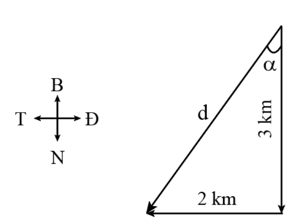 Độ dịch chuyển: d = d1 + d2 = 5 − 12 = − 7km đi theo hướng Nam.