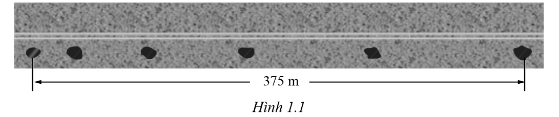Một ô tô chạy thử nghiệm trên một đoạn đường thẳng. Cứ 5 s thi có một giọt dầu từ động cơ rơi thẳng xuống mặt đường. Hình 1.1 cho thấy mô hình các giọt dầu để lại trên mặt đường.