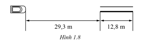 Một ô tô đang đi trên đường thẳng với tốc độ v thì trước mặt ô tô đột ngột xuất hiện một mối nguy hiểm. Trong khoảng thời gian từ khi mối nguy xuất hiện đến khi phanh hoạt động, ô tô chuyển động được quãng đường 29,3 m. Khi phanh hoạt động làm bánh xe ngừng quay, các bánh xe của ô tô để đạt vết trượt dài 12,8m trên đường, như minh họa trong hình 1.8.