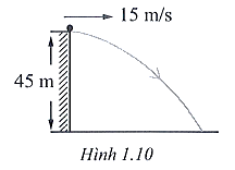 Một hòn đá được ném từ đỉnh của một vách đá thẳng đứng, cao 45 m so với mặt đất, với vận tốc ban đầu có độ lớn 15 m/s theo phương ngang (hình 1.10). Mất bao lâu để hòn đá đến mặt đất? Nó cách chân vách đá bao xa khi chạm đất?