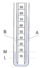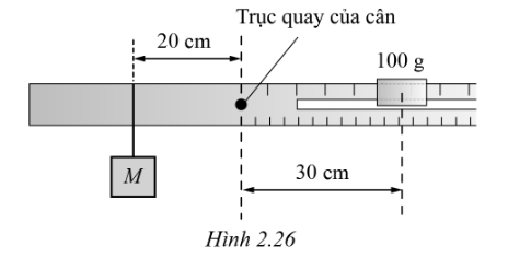 Một cân đòn sử dụng khối lượng trượt 100 g để cân vật M. Cân đạt được sự cân bằng khi hệ vật nằm ở vị trí như hình 2.26. Xác định khối lượng của vật M được cân trong trường hợp này.