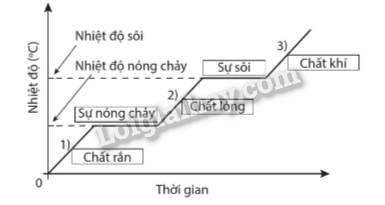 b) Trên trục nhiệt độ chỉ ra nhiệt độ nóng chảy và nhiệt độ sôi của chất đang xét.