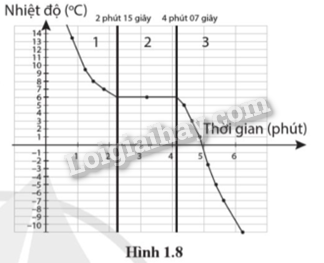 Đồ thị thực nghiệm Hình 1.8 biểu diễn sự thay đổi của nhiệt độ theo thời gian trong quá trình chuyển thể của benzene. Cho biết ở 12°C, benzene ở thể lỏng. Hãy cho biết: