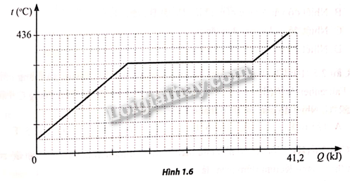 Đồ thị biểu diễn sự thay đổi nhiệt độ của một miếng chì theo nhiệt lượng cung cấp được mô tả như Hình 1.6. Biết nhiệt nóng chảy riêng của chì là 0,25.105 J/kg.