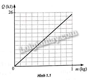 Đồ thị ở Hình 1.1 biểu diễn sự phụ thuộc nhiệt lượng cần cung cấp để làm nóng chảy hoàn toàn một miếng kim loại theo khối lượng kim loại đó. Dựa vào đồ thị, hãy cho biết đây là kim loại gì. Biết nhiệt nóng chảy riêng của sắt, chì, bạc, thiếc lần lượt là 2,77.105 J/kg, 0,25.105 J/kg, 1,05.105 J/kg, 0,61.105 J/kg.