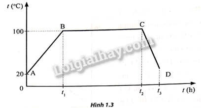 Đồ thị ở Hình 1.3 biểu diễn sự thay đổi nhiệt độ của nước theo thời gian đun và sau đó để nguội. Hãy cho biết đặc điểm từng quá trình về nhiệt độ và nhiệt lượng nước trao đổi tương ứng với từng đoạn của đồ thị.