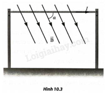 Một đường dây tải điện thẳng dài 42 m có dòng điện với cường độ 150 A chạy qua theo hướng về phía Bắc. Từ trường Trái Đất tại vị trí này có độ lớn khoảng 0,5.10-4 T, có hướng lệch một góc α = 50° so với dòng điện (Hình 10.3). Xác định lực từ tác dụng lên đường dây nói trên.