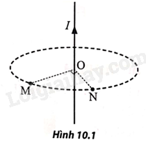 Xét một dây dẫn thẳng dài vô hạn có dòng điện cường độ I chạy qua. Hai điểm M, N nằm trong cùng một mặt phẳng vuông góc với dây dẫn và cách đều dây dẫn, biết OM vuông góc với ON (Hình 10.1).