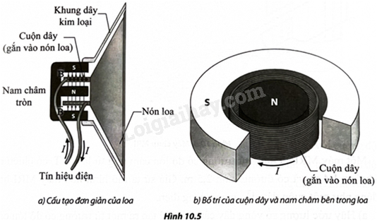 Cấu tạo đơn giản của bộ phận tạo ra sự dao động của không khí của loa gồm hai phần: nam châm hình tròn được đặt cố định, trọng tâm nam châm đặt thẳng hàng với trọng tâm màng loa và cuộn dây hình tròn (Hình 10.5b). Khi dòng điện thay đổi theo thời gian chạy qua cuộn dây đặt trong từ trường của nam châm sẽ làm xuất hiện lực từ tác dụng lên cuộn dây, lực từ này có chiều thay đổi làm nón loa dao động theo, từ đó tạo ra âm thanh phát ra tương ứng với tín hiệu âm thanh đầu vào.