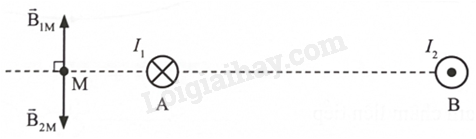 Do điểm M nằm ngoài khoảng giữa hai dây dẫn nên dòng điện I2 phải ngược chiều với dòng điện I1. Giả sử hai dòng điện có chiều như hình vẽ: