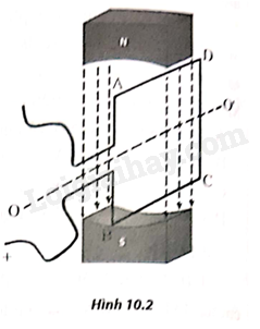 Động cơ điện là thiết bị có thể chuyển hoá năng lượng điện thành cơ năng (chuyển động quay của động cơ). Mô hình đơn giản của một động cơ điện gồm: một khung dây dẫn hình chữ nhật ABCD đang có dòng điện không đổi chạy qua. Khung dây được đặt vào trong từ trường đều có các đường sức từ thẳng đứng như Hình 10.2. Tại thời điểm ban đầu, khung đang ở vị trí sao cho hai cạnh AB và CD đang song song với các đường sức từ. Vẽ các lực từ tác dụng lên các cạnh của khung dây. Các lực này có tác dụng làm cho khung dây chuyển động như thế nào?