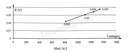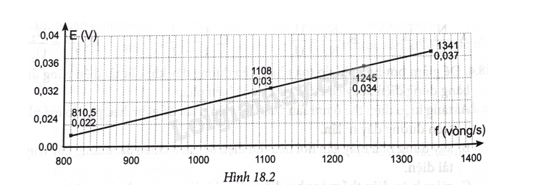 Một máy phát điện xoay chiều có rôto là nam châm vĩnh cửu mà tốc độ quay thay đổi được, cuộn dây được đặt trên stato. Dùng tần số kế điện tử đo được tần số f (vòng/s) của rôto và vôn kế đo suất điện động E(V) ở hai đầu cuộn dây. Kết quả được biểu diễn bằng đồ thị Hình 18.3.