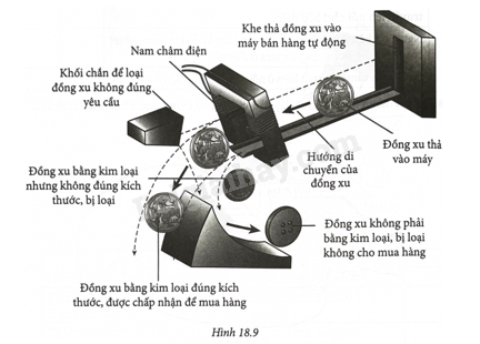 Hình 18.9 trình bày một sơ đồ phân loại đồng xu trong máy bán hàng tự động. Có một máng nghiêng cho đồng xu chuyển động từ khe thả đồng xu đến nam châm điện. Nếu không có lực nào cản chuyển động của đồng xu hoặc lực cản rất nhỏ thì đồng xu sẽ đập vào khối chắn, rơi theo hướng bị loại, không được chấp nhận để mua hàng.