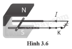 Thanh kim loại dẫn điện có thể lăn không ma sát dọc theo hai đoạn dây dẫn không nhiễm từ (Hình 3.6). Khi đóng công tắc K, dòng điện chạy theo chiều mũi tên.