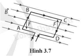 Một khung dây dẫn hình chữ nhật có AB = CD = 0,05 m; BC = 0,08 m. Khung dây nằm trong từ trường có B = 0,10 T. Cường độ dòng điện trong khung dây là 2 A. Tính mômen quay tác dụng lên khung dây ở vị trí như Hình 3.7.