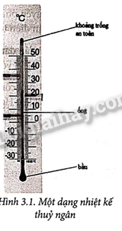 Nhiệt kế thuỷ ngân (tương tự như Hình 3.1) được chế tạo bao gồm một bầu nhỏ có chứa thuỷ kh ngân gắn với một ống thuỷ tinh có đường kính hẹp. Thể tích thuỷ ngân trong ống là không đáng kể so với thể tích của bầu. Thể tích thuỷ ngân thay đổi theo nhiệt độ và được thấy rõ qua sự thay đổi độ cao của thuỷ ngân trong ống. Không gian phía trên thuỷ ngân có thể được lấp đầy bằng nitrogen ở áp suất thấp. Hãy giải thích cách mà chúng ta có thể chia các vạch hiển thị mức nhiệt độ theo thang Celsius như hình bên.