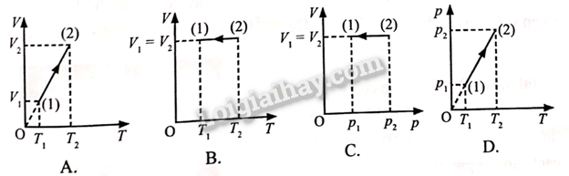 Vì đây là quá trình biến đổi đẳng áp. Trong hệ toạ độ \[VOT\], đường đẳng áp là đường thẳng có đường kéo dài qua gốc toạ độ, nên Hình A thoả mãn.