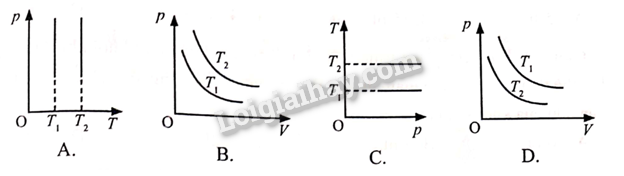Một khối khí lí tưởng xác định thực hiện quá trình biến đổi đẳng nhiệt ở hai nhiệt độ khác nhau T1 và T2 (trong đó T2 > T1). Hình nào sau đây diễn tả không đúng dạng đường đẳng nhiệt trong hệ toạ độ tương ứng?