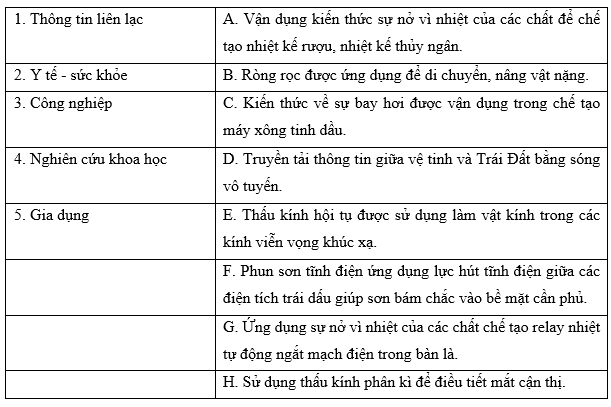 Ghép các ứng dụng vật lí ở cột bên phải với các lĩnh vực nghề nghiệp trong cuộc sống tương ứng ở cột bên trái (một lĩnh vực nghề nghiệp có thể có nhiều ứng dụng vật lí liên quan)