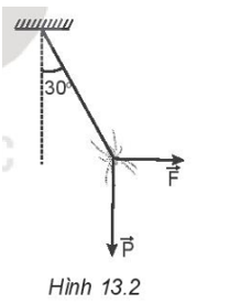 Một con nhện đang treo mình dưới một sợi tơ theo phương thẳng đứng thì bị một cơn gió thổi theo phương ngang làm dây treo lệch đi so với phương thẳng đứng một góc 30°. Biết trọng lượng của con nhện là P = 0,1 N. Xác định độ lớn của lực mà gió tác dụng lên con nhện ở vị trí cân bằng trong Hình 13.2.