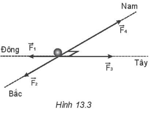 Một vật chịu tác dụng đồng thời của bồn lực như Hình 13.3. Độ lớn của các lực lần lượt là F1 = 10 N, F2 = 20 N, F3 = 22 N, F4 = 36 N. Xác định phương, chiều và độ lớn của hợp lực do các lực này tác dụng lên vật.