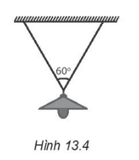 Một cái đèn được treo vào hai sợi dây giống nhau như Hình 13.4. Biết trọng lượng của đèn là 25 N, hai dây làm thành góc 60°. Xác định lực căng của dây.