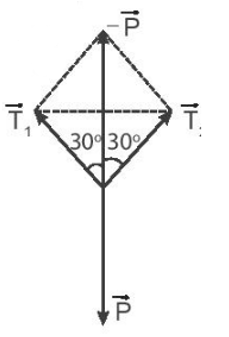 \(\overrightarrow {{T_1}} + \overrightarrow {{T_2}} + \overrightarrow P = \overrightarrow 0 \) => \(\overrightarrow {{T_1}} + \overrightarrow {{T_2}} = - \overrightarrow P \)