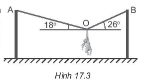 Một chú khỉ diễn xiếc treo mình cân bằng trên dây thừng như Hình 17.3. Xác định lực căng xuất hiện trên các đoạn dây OA, OB. Biết chú khỉ có khối lượng 7 kg. Lấy g = 9,8 m/s2.