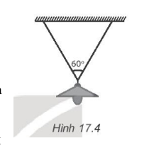b) Người ta đã treo đèn này bằng cách luôn sợi dây qua một cái móc của đèn và hai đầu dây được gắn chặt trên trần nhà (Hình 17.4). Hai đầu dây có chiều dài bằng nhau và hợp với nhau một góc bằng 60°. Tính lực căng của mỗi nủa sợi dây.