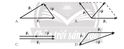 Trong các hình dưới đây, các hình vẽ nào biểu diễn đúng vecto độ biến thiên động lượng \(\Delta \overrightarrow p = \overrightarrow {{p_2}} - \overrightarrow {{p_1}} \)? (Có thể có nhiều hơn một đáp án đúng)