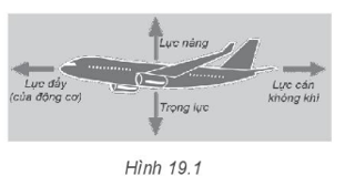 Trên Hình 19.1 biểu diễn các vectơ lực tác dụng lên một máy bay đang bay ngang ở độ cao ổn định với tốc độ không đổi. Nếu khối lượng tổng cộng của máy bay là 77 tấn thì lực nâng có độ lớn bằng bao nhiêu? Lấy g= 10 m/s2.