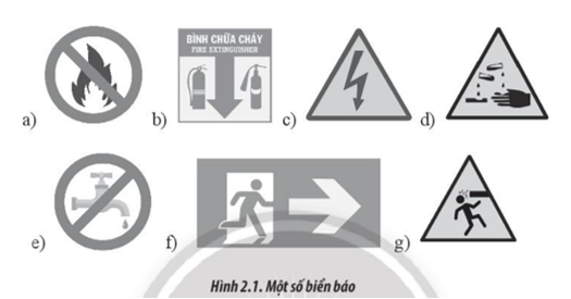 - Biển báo nguy hiểm: c (biển cảnh báo nguy hiểm có điện), d (biển cảnh báo hóa chất ăn mòn), g (biển cảnh báo va chạm đầu).