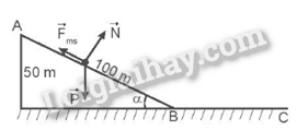 Một người ngồi trên xe trượt tuyết (có tổng khối lượng 75 kg) trượt không vận tốc ban đầu từ đỉnh đồi xuống chân đồi dài 100 m, cao 50 m. Hệ số ma sát giữa xe và mặt tuyết là 0, 11. Gia tốc trọng trường là 9,8 m/s2.