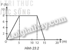 Một vật có khối lượng m = 2 kg đang đứng yên thì bị tác dụng bởi lực F và nó bắt đầu chuyển động thẳng. Độ lớn của lực F và quãng đường s mà vật đi được được biểu diễn trên đồ thị Hình 23.2.