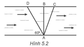 Một ca nô chạy ngang qua một dòng sông, xuất phát từ A, hướng mũi về B. Sau 100 s, ca nô cập bờ bên kia ở điểm C cách B 200 m. Nếu người lái hướng mũi ca nô theo hướng AD và vẫn giữ tốc độ máy như cũ thì ca nô sẽ cập bờ bên A kia tại đúng điểm B. Tìm: