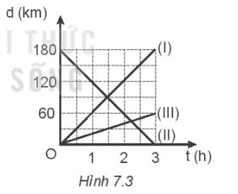 Ta có vận tốc của chuyển động (I) là: v1 = \(\frac{{\Delta d}}{{\Delta t}}\)= \(\frac{{{d_1} - {d_0}}}{{{t_1} - {t_0}}}\)= \(\frac{{180 - 0}}{{3 - 0}}\)= \(\frac{{180}}{3}\)= 60 km/h
