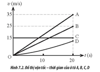 Hình 7.2 mô tả đồ thị (v – t) của bốn xe ô tô A, B, C, D. Nhận định nào sau đây là đúng?