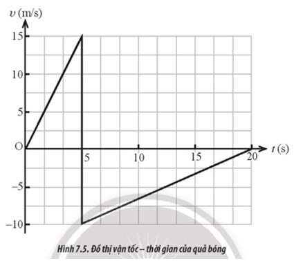 Một quả bóng bàn được bắn ra theo phương ngang với vận tốc đầu bằng không đến va chạm vào tường và bật lại trong khoảng thời gian rất ngắn. Hình 7.5 là đồ thị (v – t) mô tả chuyển động của quả bóng trong 20 s đầu tiên. Tính quãng đường mà quả bóng bay được trong 20 s kể từ lúc bắt đầu chuyển động.