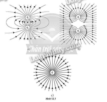 Hình 12.1 mô tả đường sức điện của các điện tích. Hãy xác định dấu của các điện tích trong từng trường hợp.