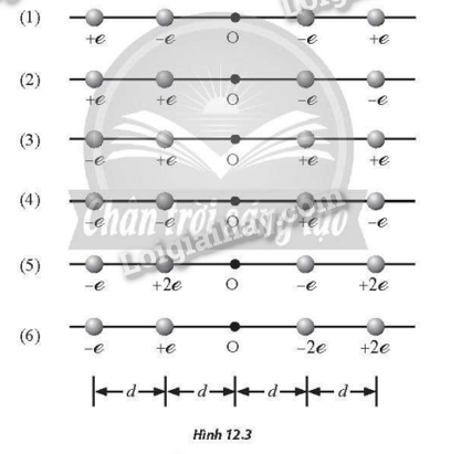 Hình 12.3 mô tả 6 trường hợp sắp xếp 4 điện tích điểm, trong đó các điện tích được đặt cách đều nhau bên trái và bên phải so với điểm O. Hãy sắp xếp độ lớn cường độ điện trường tại điểm O theo thứ tự tăng dần.