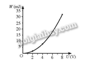 c) Vẽ đồ thị biểu diễn mối liên hệ giữa năng lượng dự trữ trong tụ W và hiệu điện thế giữa hai bản tụ U. Mô tả hình dạng của đồ thị này. Từ đó, hãy cho biết W phụ thuộc vào U như thế nào.