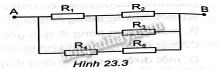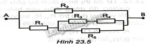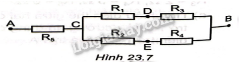 Cho mạch điện như Hình 23.5. Giá trịcác điện trở: \({R_1} = 5\Omega \),\({R_2} = 7\Omega \),\({R_3} = 1\Omega \), \({R_4} = 5\Omega \),\({R_5} = 3\Omega \). Hiệu điện thế giữa hai đầu đoạn mạch \({U_{AB}} = 21V\)
